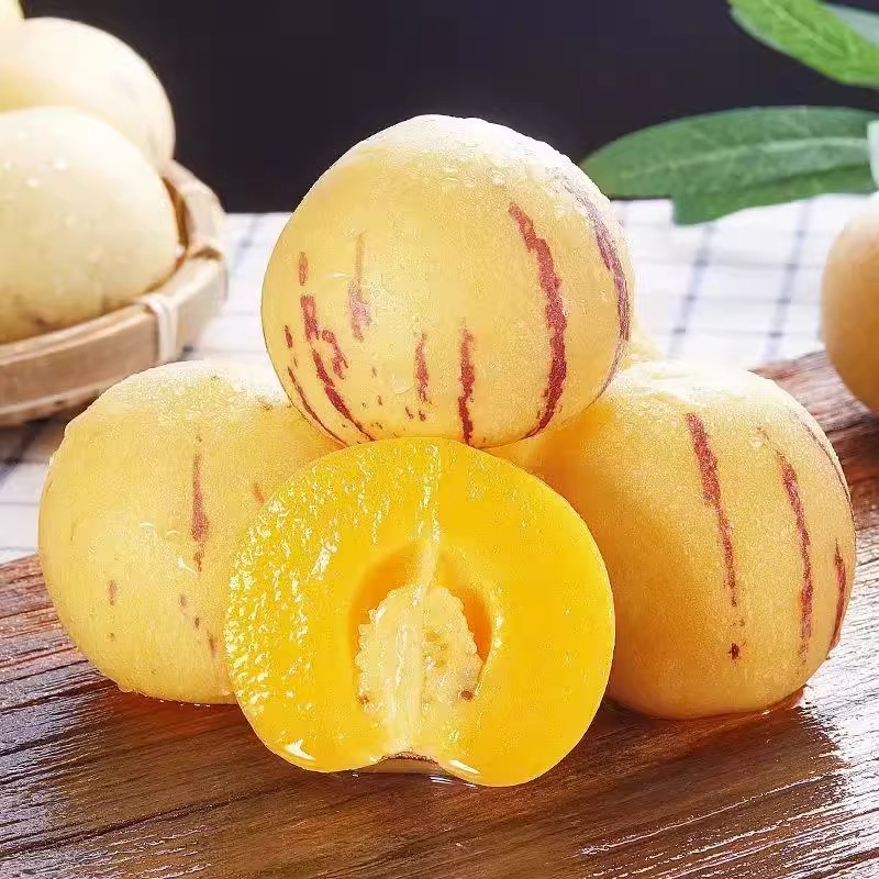 Cantaloupe: The fruit is oval or round, the peel is green or yellow, the fruit meat is sweet and juicy, and it is rich in nutrients such as vitamin C and minerals, which help to antioxidant and enhance immunity.